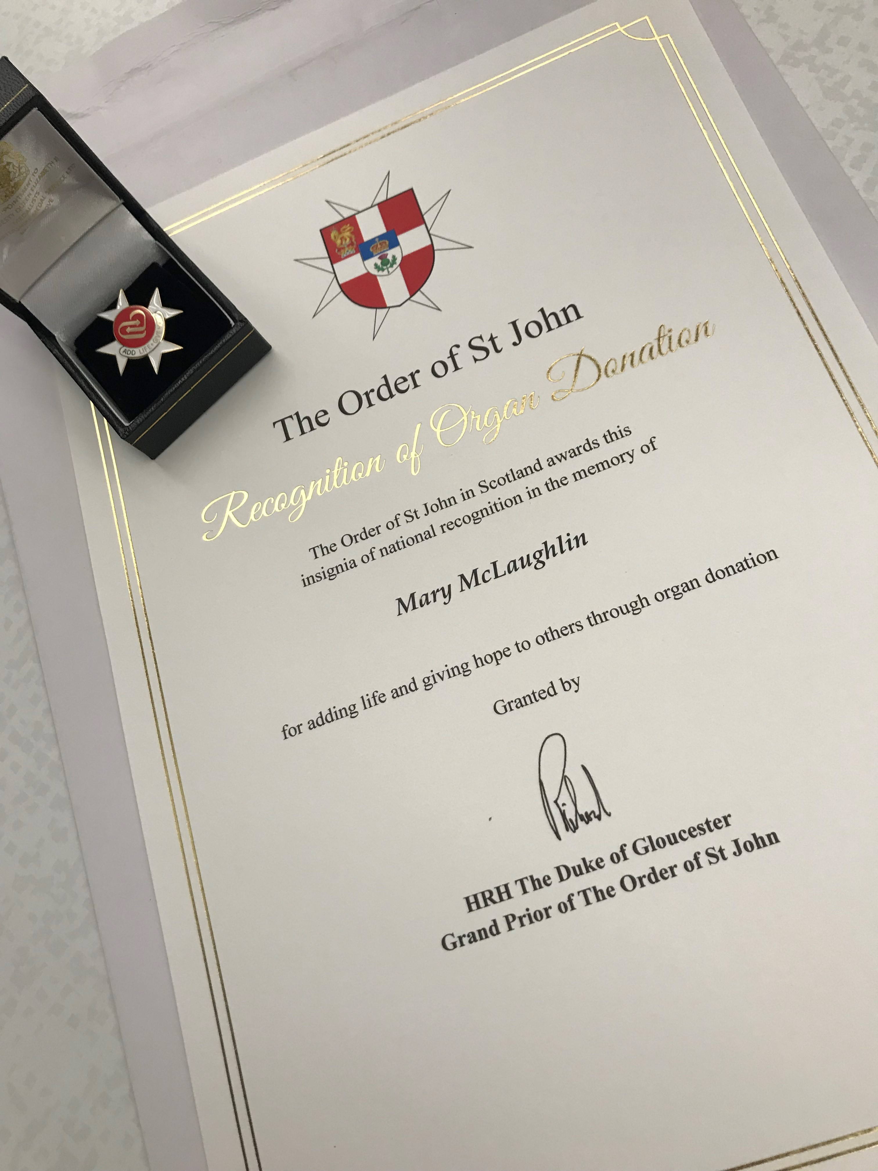 Mary was given the Order of St John award for her kidney donation.