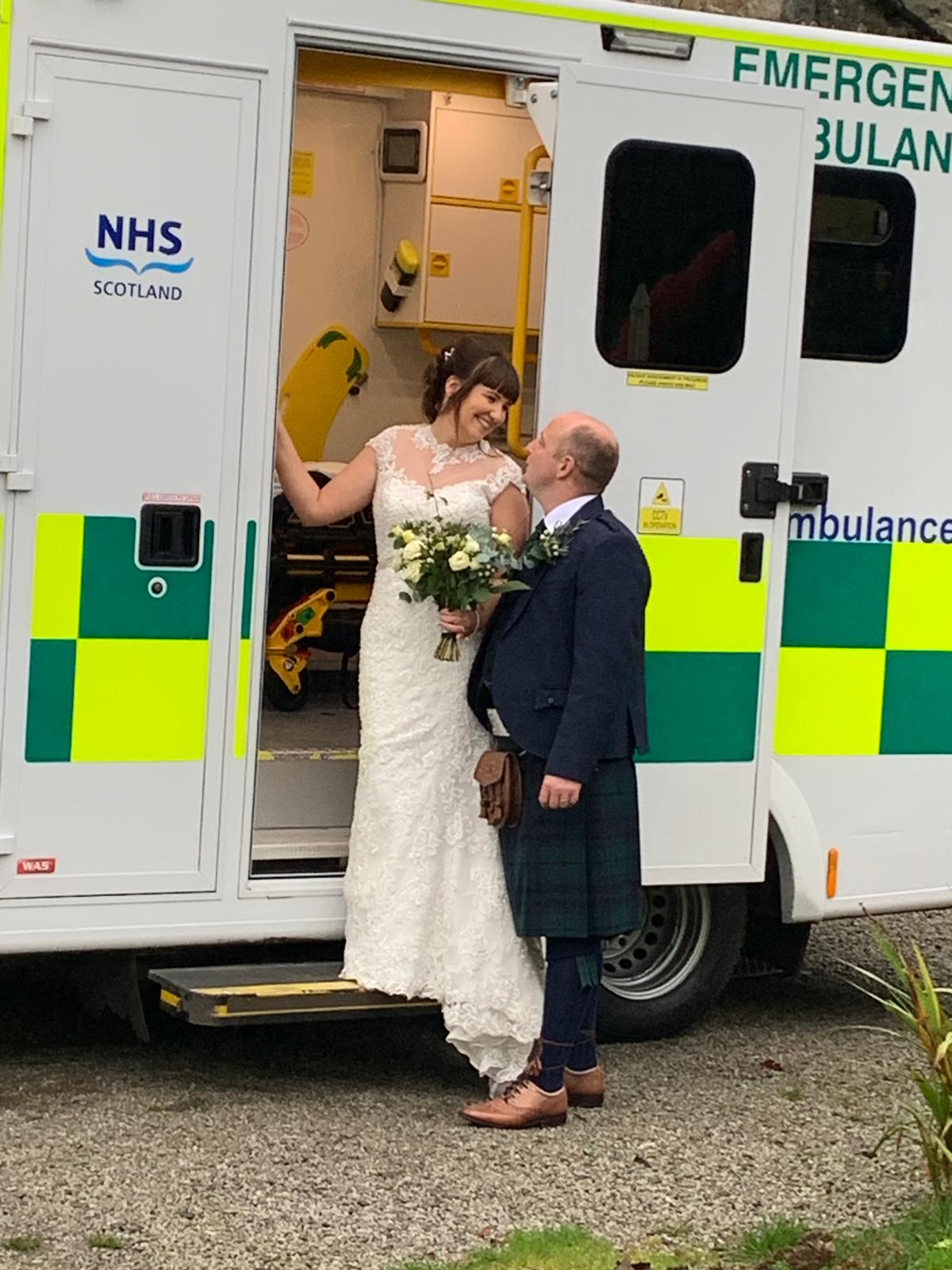 Two Scottish Ambulance Service staff members from Dumfries and Galloway have tied the knot at a ceremony attended by friends, family, coworkers - and with an ambulance as a backdrop.